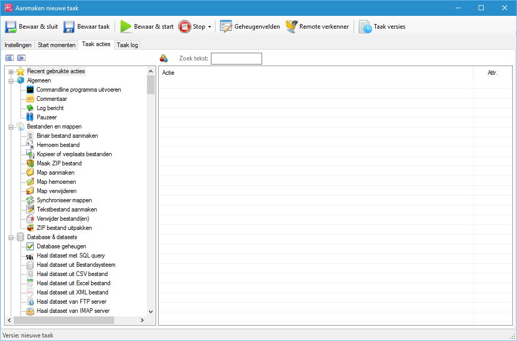 In dit voorbeeld ziet u dus een lege taak. Hierin moeten nog een of meerdere acties worden gekozen. Deze voegt u toe vanuit de beschikbare acties.
