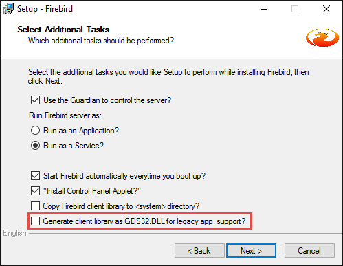 6. Door het instellen van een aantal opties kan worden aangegeven hoe Firebird zich dient te gedragen. Hierbij mag de onderste optie (Generate client library....) worden uitgevinkt.