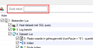 Indien de te zoeken term wordt gevonden in een taakactie, zal de betreffende regel in het taakscherm een paarse kleur krijgen. Tevens wordt bij de attributen (afgekort Attr.) de letter S weergegeven: